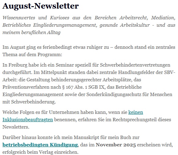 In meinem monatlich erscheinenden Newsletter berichte ich über Wissenswertes und Kurioses aus den Bereichen Arbeitsrecht, Mediation, Betriebliches Eingliederungsmangement, Coaching und aus meinem beruflichen Alltag.