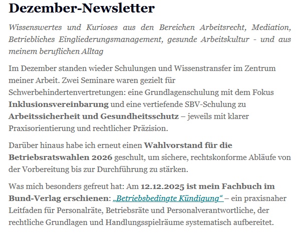 In meinem monatlich erscheinenden Newsletter berichte ich über Wissenswertes und Kurioses aus den Bereichen Arbeitsrecht, Mediation, Betriebliches Eingliederungsmangement, Coaching und aus meinem beruflichen Alltag.