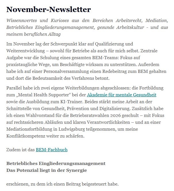 In meinem monatlich erscheinenden Newsletter berichte ich über Wissenswertes und Kurioses aus den Bereichen Arbeitsrecht, Mediation, Betriebliches Eingliederungsmangement, Coaching und aus meinem beruflichen Alltag.